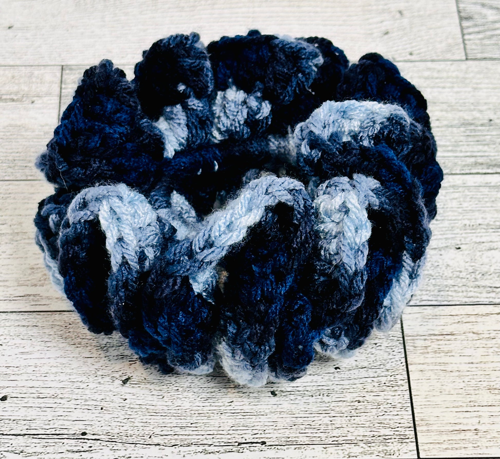Add a touch of cool, wintery style to your hairstyle with the Lunar Tide Ruffle Scrunchie. Handmade with soft acrylic yarn in deep navy, steel blue, and icy gray tones, this scrunchie brings a bold, frosty aesthetic to any look. It’s stretchy, comfortable, and gentle on your hair—perfect for everyday wear, winter outfits, or anyone who loves dark and moody tones.