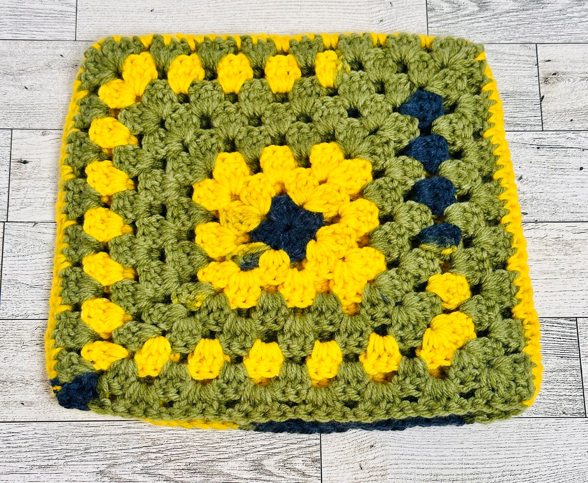 • Handmade with sunflower-inspired granny squares