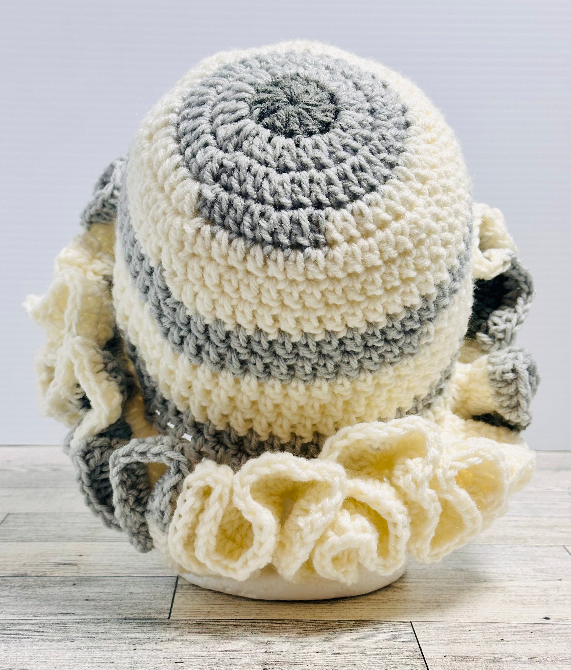 Wrap up in cozy elegance with the Soft Stone Ruffle Hat. Hand-crocheted using durable acrylic yarn in warm cream and soft grey stripes, this hat features a beautifully ruffled brim that adds movement and charm to any cold-weather outfit. Designed for comfort and made to last, it’s the perfect neutral accessory for winter days, gifting, or anyone who loves soft and simple style with a playful twist.